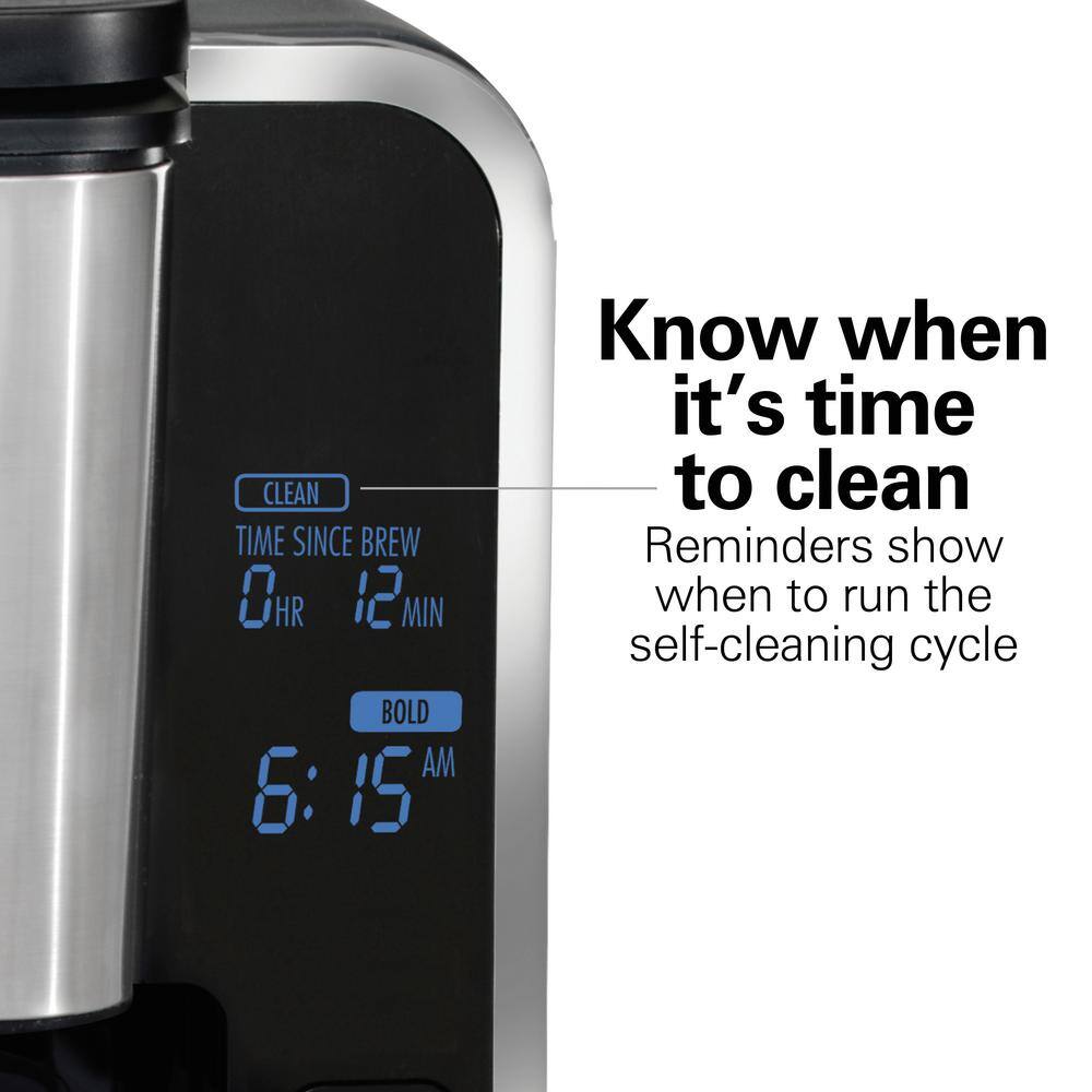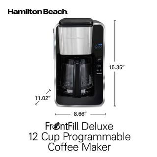 The Hamilton Beach Front Fill Deluxe 12 Cup Programmable Coffee Maker is easy to fill from the front with a Front Fill water reservoir and swing-open brew basket for coffee grounds. It's easy to program the coffee maker and clock with intuitive digital controls and Easy-Touch programming. Set the coffee maker up to 24 hours ahead for fresh hot coffee in the morning when you wake up. Customize the strength of your coffee to suit your tastes with the Select-a-Brew brew-strength selector. Choose from bold, regular, and 1-4 cup brew strength options. The coffee maker automatically turns off after 2 hours for peace of mind, and the \"Time Since Brew\" freshness indicator shows you how long since your coffee brewed to ensure you're always drinking fresh coffee. The coffee maker reminds you when it's time to run the self-cleaning cycle for consistently great-tasting coffee cup after cup. The 12 cup carafe and Lift and Clean brew basket are both dishwasher safe. Auto Pause and Pour stops the flow of coffee when you lift the carafe to pour a cup of coffee before the brewing stops without making a mess. The no-drip design of the 12 cup borosilicate glass carafe eliminates mess.