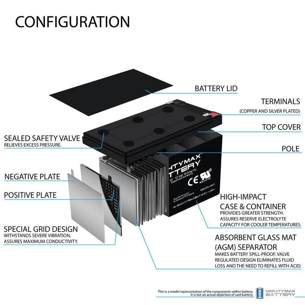 Delivering power when you need it, the MIGHTY MAX ML15-12 12-Volt 15 Ah uses a state of the art, heavy-duty, calcium-alloy grid that provides exceptional performance and service life in both float and cyclic applications. The ML15-12 is an Absorbent Glass Mat (AGM) technology with a valve regulated design, that can be used in enclosed and indoor environments without leaking or maintenance, providing a superior performance for thousands of models. MIGHTY MAX SLA batteries are utilized in a wide variety of applications including, Consumer Electronics, Electric Vehicles, Engine Starters, Golf Carts, Hunting, Lawn and Garden Tools, Medical Mobility, Motorcycles, Power sports, Portable Tools, Solar, Toys and Hobby, Access Control Devices, Emergency Lighting, Security and more.